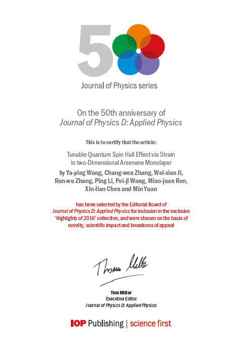 近期,JPhys系列期刊50周年庆,青青草原纳米自旋电子材料与器件课题组在Journal of Physics D: Applied Physics发表的论文“Tunable Quantum Spin Hall Effect via Strain in two-Dimensional Arsenene Monolayer”被选为2016年Highlights(亮点)文章。