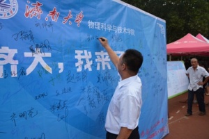 领导、老师们亲切交谈,并在新生签字板“济大,我来了”留下自己的签名,表达对新生的热烈欢迎,并对青青草原