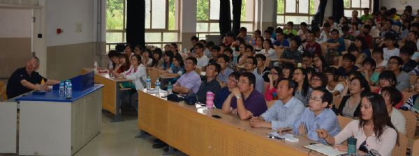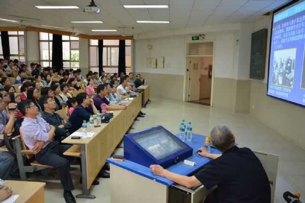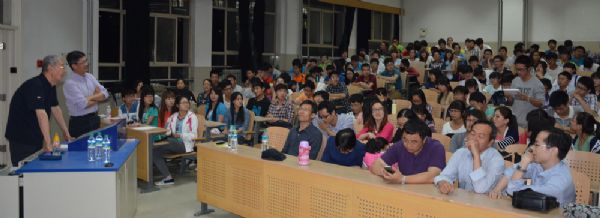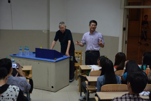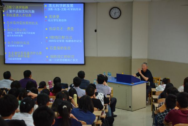 院长王少清首先对郭奕玲和沈慧君二老作了简要介绍并表示了诚挚的欢迎。随后,郭教授通过六个主题,从多个角度阐释了数十年来在诺贝尔奖方面取得成功的伟大科学家们的个人事迹与成功分析,分别是:实验自然科学基础;科学家的情操;机遇与挑战;个人与团队;夯实基础;广泛的兴趣。在报告中郭老谈到,诺贝尔奖是现代科学的伟大成就的缩影,折射出现代物理学发展趋势,希望同学们能够从这些著名科学家的身上感受到他们为科学事业不求回报,不断进取的伟大精神,并将这种精神转化到同学们的日常学习中去,他风趣幽默的口吻及深入浅出的报告赢得了师生们阵阵掌声与赞叹。讲座期间,郭教授采用了大量图文资料,并以物理科学发展史为主线,讲述了诺贝尔奖获得者拉比、霍尔、费曼、爱因斯坦、丁肇中以及李政道等人的求学及探索科学的历程,勉励同学们要永远保持一颗好奇心,同时拥有顽强的信念及坚忍不拔的精神。同时用杨振宁的3P精神及施一公的事迹来激发同学们对探索自然科学的兴趣。最后,讲座进入互动环节,老师与同学们积极提出了疑问,郭教授一一作出了回答。同时,郭教授深情地寄语在场同学,希望大家能有勤奋的态度、创新的精神,不要坐等机遇,要积极寻求、把握机遇。