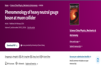 近日,粒子物理团队在知名期刊《Science China Physics, Mechanics & Astronomy》上发表了题为“Phenomenology of heavy neutral gauge boson at muon collider”的研究文章。SCPMA为中科院一区期刊,影响因子6.4。研究生芦宗洋担任第一作者,李洪蕾教授为学生导师兼通讯作者。