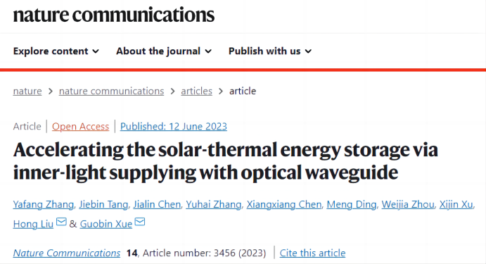的薛国斌教授、刘宏教授团队提出了一种内通光模式增强太阳能相变速率的策略,通过侧发光光波导纤维将太阳光传输到石蜡-石墨烯复合材料中,在空间维度上调节太阳热转换界面。这种内部供光模式避免了蓄热材料(PCM)表面过热,充能速率比表面照射模式提高了123%,太阳能热效率提高到94.85%。此外,采用内通光供能方式的器件在大型室外也能有效工作,表明了该热固定定策略在实际应用中的潜力。。该研究成功以“Accelerating the solar-thermal energy storage via inner-light supplying with optical waveguide”为题,发表于Nature communications,第一作者为青青草原