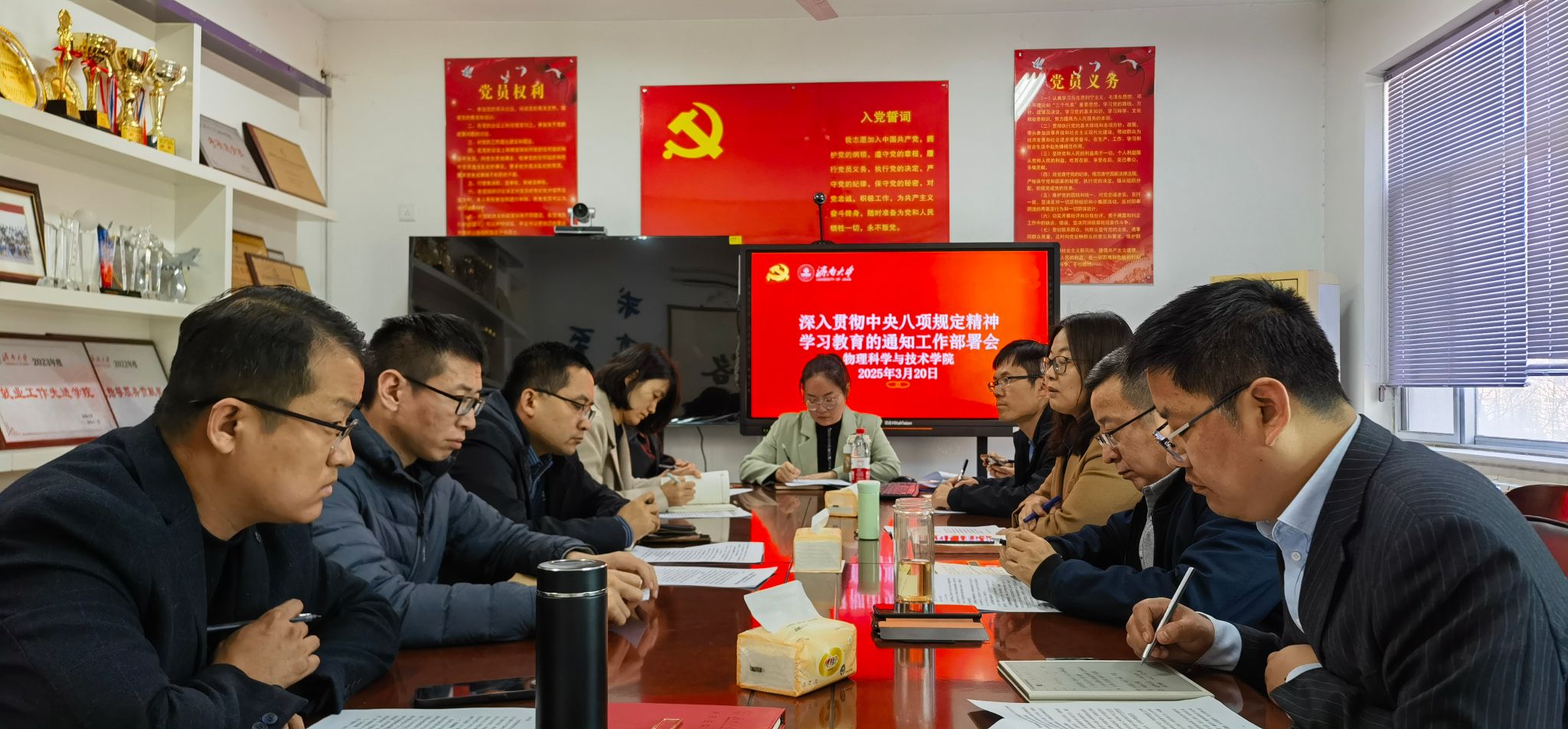 3月20日下午,青青草原 召开党建工作专题会议,积极落实学校党委部署,传达《中共青青草原 委员会关于开展深入贯彻中央八项规定精神学习教育的通知》精神,并对青青草原 下一步开展主题教育活动进行部署。青青草原 党委委员、班子成员、组织员、全体党支部书记参加会议,青青草原 党委书记丛菡菡主持会议。