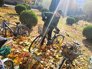 通过扶自行车这一个简单的动作,一道漂亮的风景线,同时还可以摆放更多的自行车。这一道亮丽的风景线可以使同学们在经历了繁忙的学习之后,感觉到舒适与快乐,是同学们能有个更好的心情,从而更好地投身于学习。