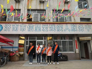志愿者们举办了以“大手牵小手,连接你我他”为主题的志愿活动,在领队王珑杭的带领下来到了信望爱残疾人康复中心看望儿童。
