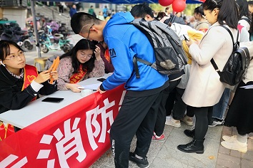 本次活动以有奖竞答的形式吸引同学前来参加,尚未到达集合时间,八食广场便已人头攒动。活动于六点三十分开始,了解了活动细则后,参赛选手们在志愿者的带领下开始了消防知识的竞答。