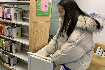 在管理员的解说和教学下,志愿者们了解了少年儿童图书馆内的图书分类和摆放规定,他们帮助管理员整理书籍,为来还书的读着提供帮助,并耐心地为每一位小朋友找到他们所需要的书籍,在找书期间,志愿者们询问孩子们喜欢的书籍和读书的感悟,他们与每位孩子轻声交谈。翰墨书香萦绕着图书馆,书桌前是孩子们专注读书的目光,书架前是志愿者们悄悄忙碌的身影。志愿者们与孩子们一同读书,将书本上的文字化成有温度的语言,志愿者们为孩子们读着一本一本的书,有充满童趣的童话故事,也有让孩子们充满奇妙想象的科幻故事。孩子们聚精会神地听着故事并在故事结束时向志愿者们提出各种有趣的问题,志愿者们也以或欢乐或新奇的答案回答他们。