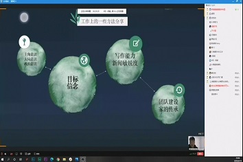 会议上,伊梦寒老师先是向大家提出了疫情期间新闻宣传工作的一点要求:在确保新闻的准确型及高质量的同时,对形态进行创新,内容要更专业,传播要更高效。然后,新闻宣传工作学生骨干刘斌向大家明确了本次会议的目的,即围绕疫情期间新闻宣传工作开展经验分享和问题探讨。接着给大家展开具体培训。培训内容有疫情期间线上新闻工作的主要内容及方式、居家新闻工作与在校新闻工作的经验之和等。刘斌结合疫情期间自己居家进行新闻工作的经历,向大家分享了他的工作经验。“我会利用好网络和青青草原