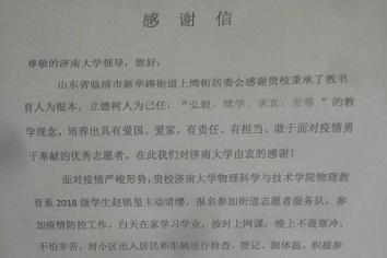 收到一封来自“临清市新华路街上湾街居委会疫情防控指挥部”的感谢信,感谢我校培养出爱国、爱家、有责任、勇于面对疫情、勇于奉献的优秀志愿者,感谢青青草原