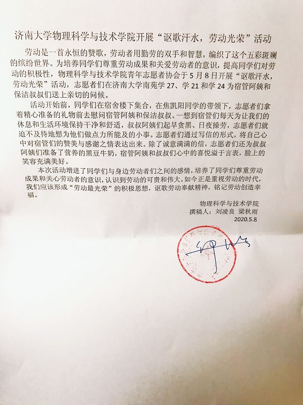 本次活动增进了同学们与身边劳动者们之间的感情,培养了同学们尊重劳动成果和关心劳动者的意识,认识到劳动的可贵和伟大。如今正是重视劳动的时代,我们应该形成“劳动最光荣”的积极思想,讴歌劳动奉献精神,铭记劳动创造幸福。