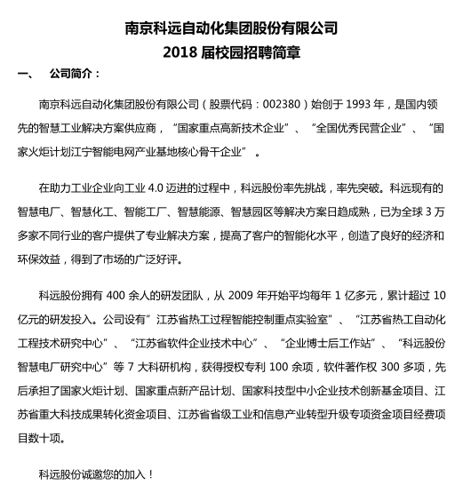 南京科远自动化集团股份有限公司 2019届校园招聘简章 一、 公司简介 南京科远自动化集团股份有限公司(股票代码:002380)始创于1993年,是国内领先的智慧工业解决方案供应商,公司秉承“让工业充满智慧、让智慧创造价值”的创新理念,致力于帮助企业实现生产过程自动化与信息化。以领先的工业自动化和信息化技术、产品与服务,保障企业的高效运营。积极践行工业4.0、“中国制造2025”等创新理念,推出“智慧电厂”、”智慧化工”、“智慧冶金”、“智能工厂”、“智慧能源”等一系列智慧工业解决方案,成为智能制造的先驱者。 科远股份拥有400余人的研发团队,年均研发投入1亿元,公司设有“江苏省热工过程智能控制重点实验室”、“江苏省热工自动化工程技术研究中心”、“江苏省软件企业技术中心”、江苏省流程工业故障诊断与数据挖掘工程中心、“企业博士后工作站”、“科远股份智慧电厂研究中心”等平台,获得授权专利100余项,软件著作权200多项,承担过国家工业强基工程、国家火炬计划、国家电子倍增计划、国家重点新产品计划、国家科技型中小企业技术创新基金项目、江苏省重大科技成果转化资金项目、江苏省省级战略性新兴产业发展专项资金项目、江苏省省级工业和信息产业转型升级专项资金项目等数十项国家、省部级科技项目。 科远股份诚邀您的加入! 二、 招聘职位及招聘要求 岗位类别 岗位方向 专业/方向要求 工作地点 学历及人数 营销类 客户代表 自动化、电气自动化、热动、热控、测控等 南京、北京、重庆、太原、郑州、云南、贵州 本科20人 开发类 大数据分析 计算机、自动化等;工业大数据&工业互联网平台设计与开发 南京 硕士5人 本科8人 智慧电厂开发(电厂智能诊断、优化运行) 热能工程相关专业 南京 硕士5人 控制系统优化开发 控制工程与控制理论、热工自动化、热能与动力工程 南京 硕士6人 应用软件开发(Java、C++、.NET) 软件工程、信息管理与信息系统、自动化、测控等 南京、武汉 硕士10人 本科20人 嵌入式软/硬件开发 自动化、电气自动化、测控、仪器仪表 南京 本科10人 电气开发 电气自动化 南京 硕士2人 技术类 自动化项目工程师 热能与动力工程、自动化、电气自动化、测控技术与仪器、机电一体化、液压与气动、化工、机械等 南京、成都、哈尔滨、济南、西安、宁夏、乌鲁木齐、石家庄、唐山、太原、武汉 本科50人 软件项目工程师 信息管理与信息系统、自动化、热能与动力工程、计算机、管理类 长春、沈阳、哈尔滨、武汉、西安、乌鲁木齐 本科30人 智能制造实施顾问 企业管理、工商管理、财务管理 南京 本科5人 电厂运行类 锅炉、汽机值班员 集控运行 徐州 大专5人 电气值班员 机电一体化、集控运行 大专4人 化水值班员 化学相关专业 大专4人 三、 福利待遇 (1) 工作时间:5天8小时工作制,提供员工宿舍及免费工作餐; (2) 有竞争力的薪资政策,激励性的奖金制度,前三年可根据能力提升快速加薪; (3) 高潜质员工最高可享30W免息购房借款; (4) 工作满2年可竞选“科远未来之星”,竞选通过,最高奖励30W安家费; (5) 五险一金及商业保险; (6) 连续五年可享南京市“人才安居”补贴; (7) 免费的员工旅游、年度健康体检、部门活动经费; (8) 结婚礼金、生子礼金、重要节日礼品、其他慰问金; (9) 丰富多彩的文体活动及文体赛事。 四、 简历投递方式 简历投递邮箱:[email protected] (邮件主题/简历名称格式:岗位名称+意向工作地点+学校+专业+学历+姓名) 更多招聘信息请咨询:025-69836011/69836268 公司网址:http://www.sciyon.com 公司总部地址:南京市江宁开发区清水亭东路1266号 南京科远自动化集团股份有限公司人资部 2018年11月 |